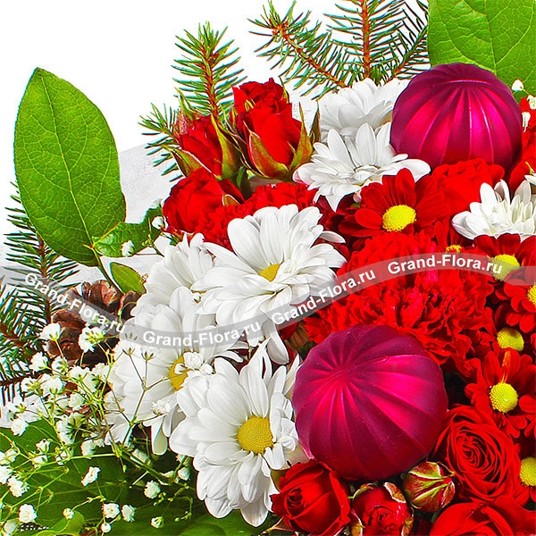 Уменьшенный: хризантема красная кустовая - 2шт., хризантема белая кустовая - 2шт., гвоздика красная - 3шт., роза красная кустовая - 1шт., гипсофила - 1шт., еловая ветвь, новогодний декор и зелень, фетр белый.