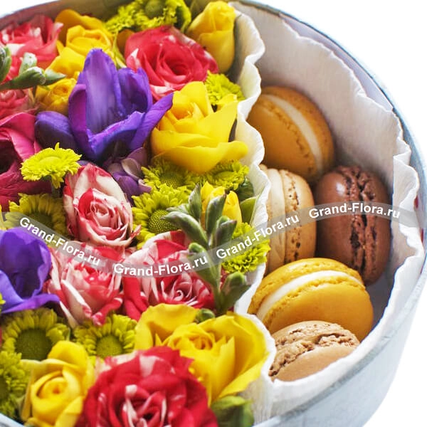 Стандартный (на фото): хризантема мелкоцветная желтая - 2 шт., фрезия фиолетовая - 2 шт., роза кустовая красная - 1 шт., роза кустовая желтая - 2 шт., рунункулюс красный - 1 шт., оазис, фетр белый, макарунс - 5 шт., коробка круглая (20х20см).