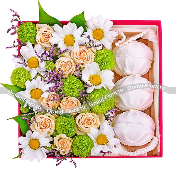 Уменьшенный: хризантема кустовая зеленая - 1шт., роза кустовая кремовая - 3 шт., хризантема кустовая белая - 2 шт.,  лимониум(статица) - 1шт., декоративная зелень, зефир, оазис, коробка.